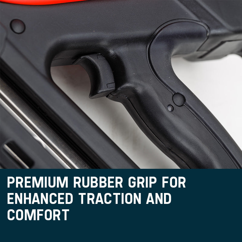 The LXG3000 features Full Sequential Actuation for maximum speed making it the ultimate choice for all types of timber and tasks, including Framing, Decking, Flooring, Crate/Pallet Assembly and much more. The unique quick-load magazine makes reloading easier, with more transparency to when you're running low on nails. Its generous 48 nail capacity also contributes to greater productivity with less load intermission. Its ergonomically designed for prolonged use with a comfortable elastomer grip and 360° variable exhaust port. Importantly, the LXG3000 accepts industry standard framing fuel cells for added convenience.